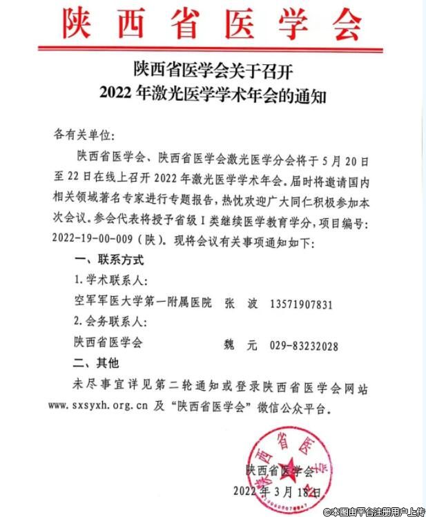 陕西省医学会、陕西省医学会激光医学分会将于5月20日至22日在线上召开2022年激光医学学术年会。届时将邀请国内相关领域着名专家进行专题报告,热忱欢迎广大同仁积极参加本次会议。参会代表将授予省级I类继续医学教育学分,项目编号:2022-19-00-009(陕)。现将会议有关事项通知如下:
