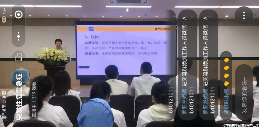 会上,美容外科脂肪整形专业组袁野主任和王学纳护士长分别深入讲解了《脂肪栓塞的预防、诊断、救治和应急预案》、《空气栓塞的预防、诊断、救治和应急预案》。本次培训线上观看学习人数共计381人,线下60多人,线上线下频频互动,气氛热烈,获得了观众的一致好评。
