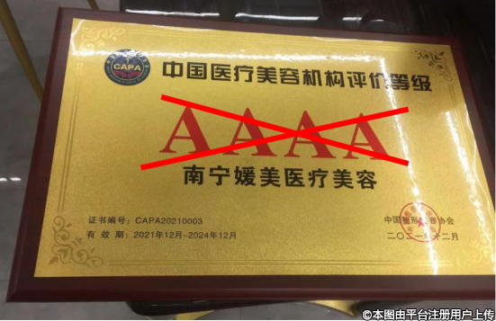 南宁媛美医疗美容伪造的4A等级牌匾