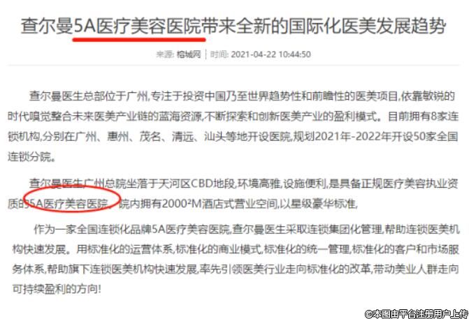 查尔曼医生连锁集团关于获评5A医疗美容医院虚假宣传网页