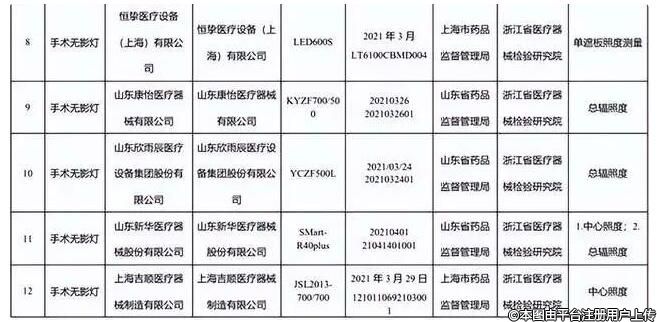 7台手术无影灯分别为山东新华医疗器械股份有限公司、河北谊安奥美医疗设备有限公司、上海吉顺医疗器械制造有限公司等7家企业生产,涉及保护接地阻抗、中心照度、单遮板照度测量、总辐照度等不符合标准规定。