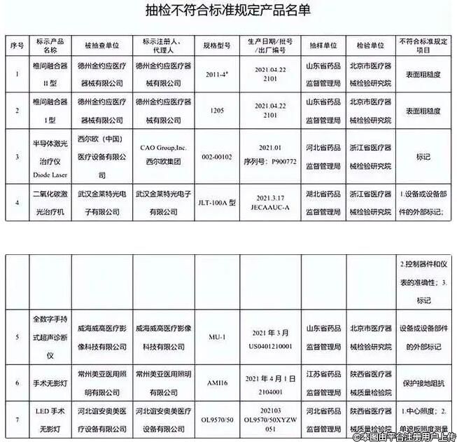 4月20日,国家药监局关于发布国家医疗器械监督抽检结果的通告,其中德州金约应医疗器械有限公司生产的椎间融合器2批次,表面粗糙度不符合标准规定;半导体激光治疗机1台:CAO Group,Inc. 西尔欧集团生产的半导体激光治疗机标记不符合标准规定;武汉金莱特光电子有限公司生产二氧化碳激光治疗机1台外部标记、控制器件和仪表的准确性、标记不符合标准规定;威海威高医疗影像科技有限公司生产的手持式超声诊断设备外部标记不符合标准规定。
