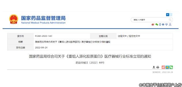 《通知》称,为鼓励重组人源化胶原蛋白新型生物材料研发创新,推动医疗器械产业高质量发展,结合产业发展和监管工作需要,经研究,国家药监局批准《重组人源化胶原蛋白》医疗器械行业标准制修订项目立项。
