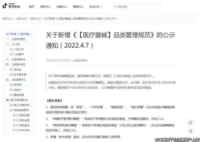 抖音对现有的品类设置进行调整,按照《医疗器械品类管理规范》的文件将此前归纳在“美妆”“个护家清”“智能家居”“滋补保健”行业中的医疗器械商品整合为新的“保健/护理/理疗器械”一级类目,同时,在次类目之下新增了“卫生/伤口/医用敷料”类目,以及“体外检测”类目。
