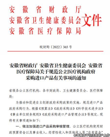 此次安徽是动真格了,直接提前法出通知,明确提出,公立医疗机构使用财政预算资金以及事业收入、经营性收入和其他收入等“自有资金”开展采购活动,应当严格执行政府采购关于进口审核的有关规定。单项或批量采购预算达到政府采购分散采购限额标准,确需采购进口产品的,实行审核管理。