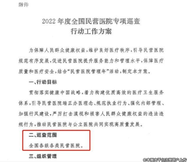 从多个渠道获悉的文件来看,国家卫健委发文时提到的巡查范围为“全国各级各类民营医院”,但又补充提到“要实现辖区内二级以上民营医院和50张床位以上民营医院全覆盖”。