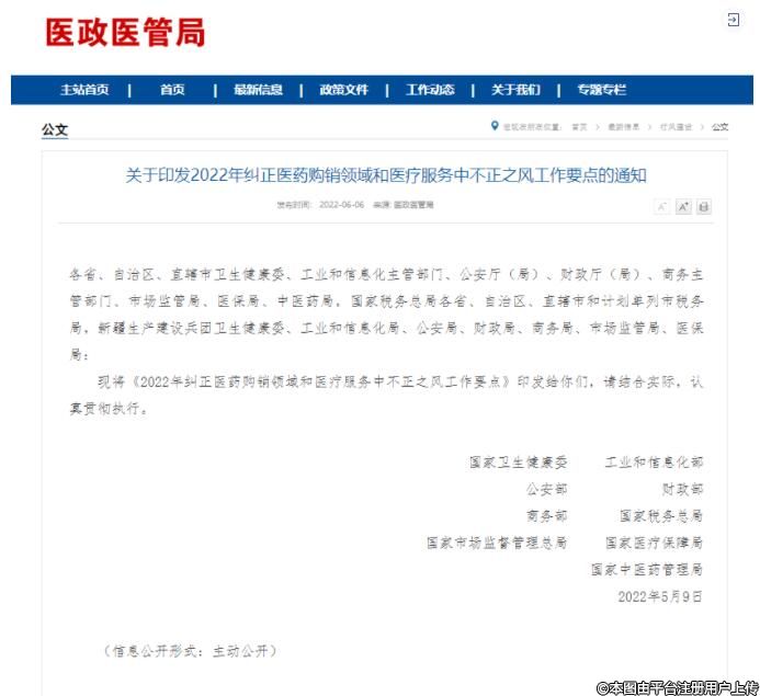 近期,国家卫生健康委员会、工业和信息化部、公安部、财政部、商务部、国家税务总局、国家市场监督管理总局、国家医疗保障局、国家中医药管理局等九部委联合印发了《关于印发2022年纠正医药购销领域和医疗服务中不正之风工作要点的通知》(国卫医函〔2022〕84号,以下简称“《通知》”),现对有关内容解读如下: