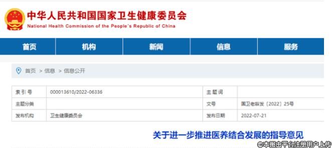 国家卫健委、国家发改委、民政部、住建部、财政部等十一个部门联合发布《关于进一步推进医养结合发展的指导意见》,提出鼓励社区医疗机构利用现有资源内部改扩建医养结合设施,发挥中医、保险、信息化等多元支持作用。