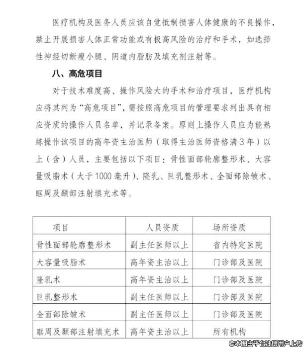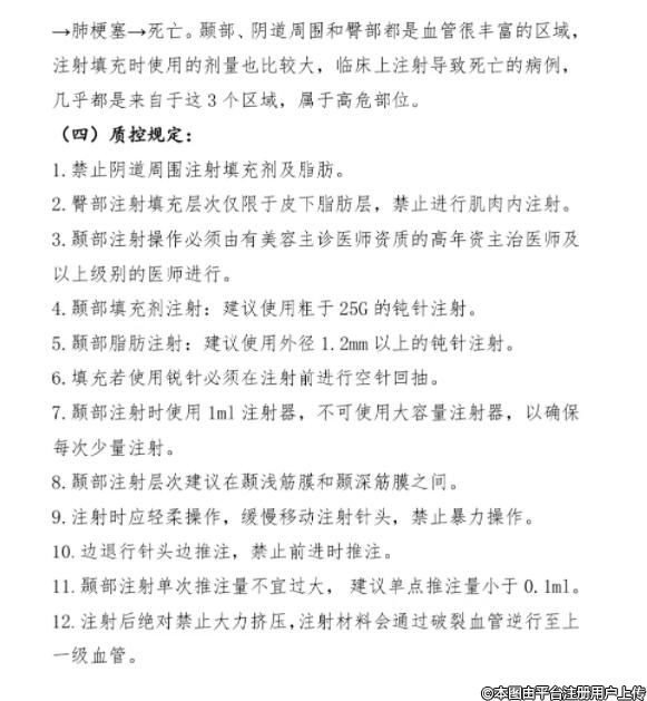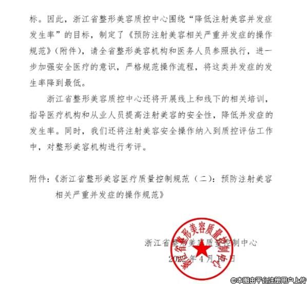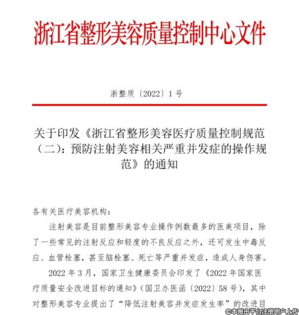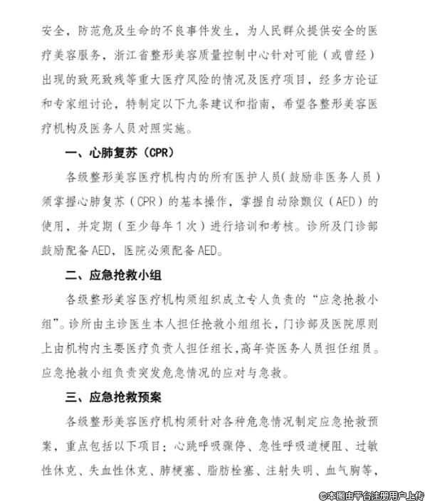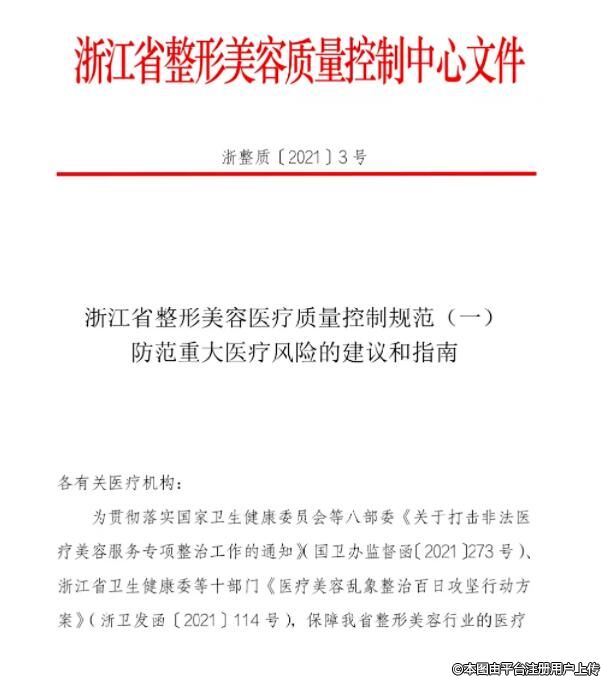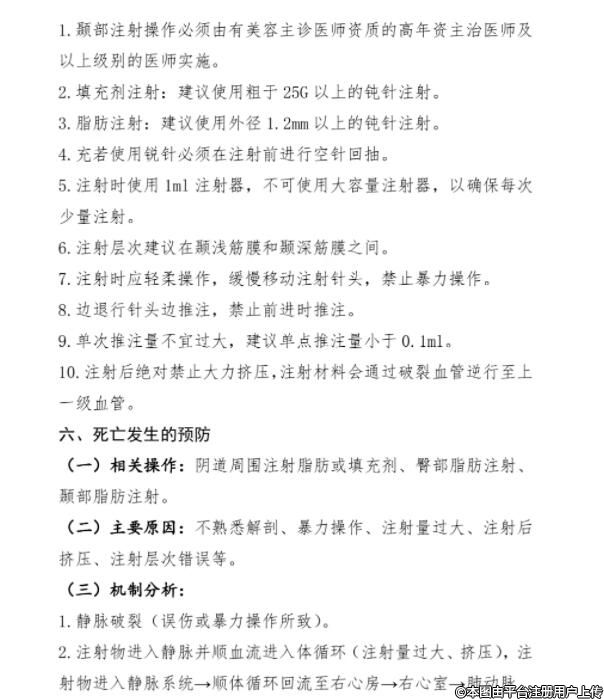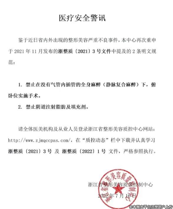 浙江省整形美容质量控制中心发布《医疗安全警讯》,再次重申:1、禁止在没有气管内插管的全身麻醉(静脉复合麻醉)下,俯卧位实施手术;2、禁止阴道注射脂肪及填充剂。