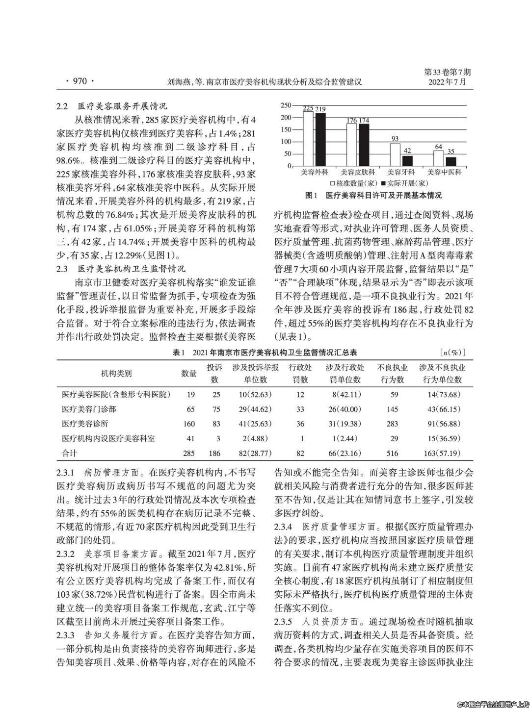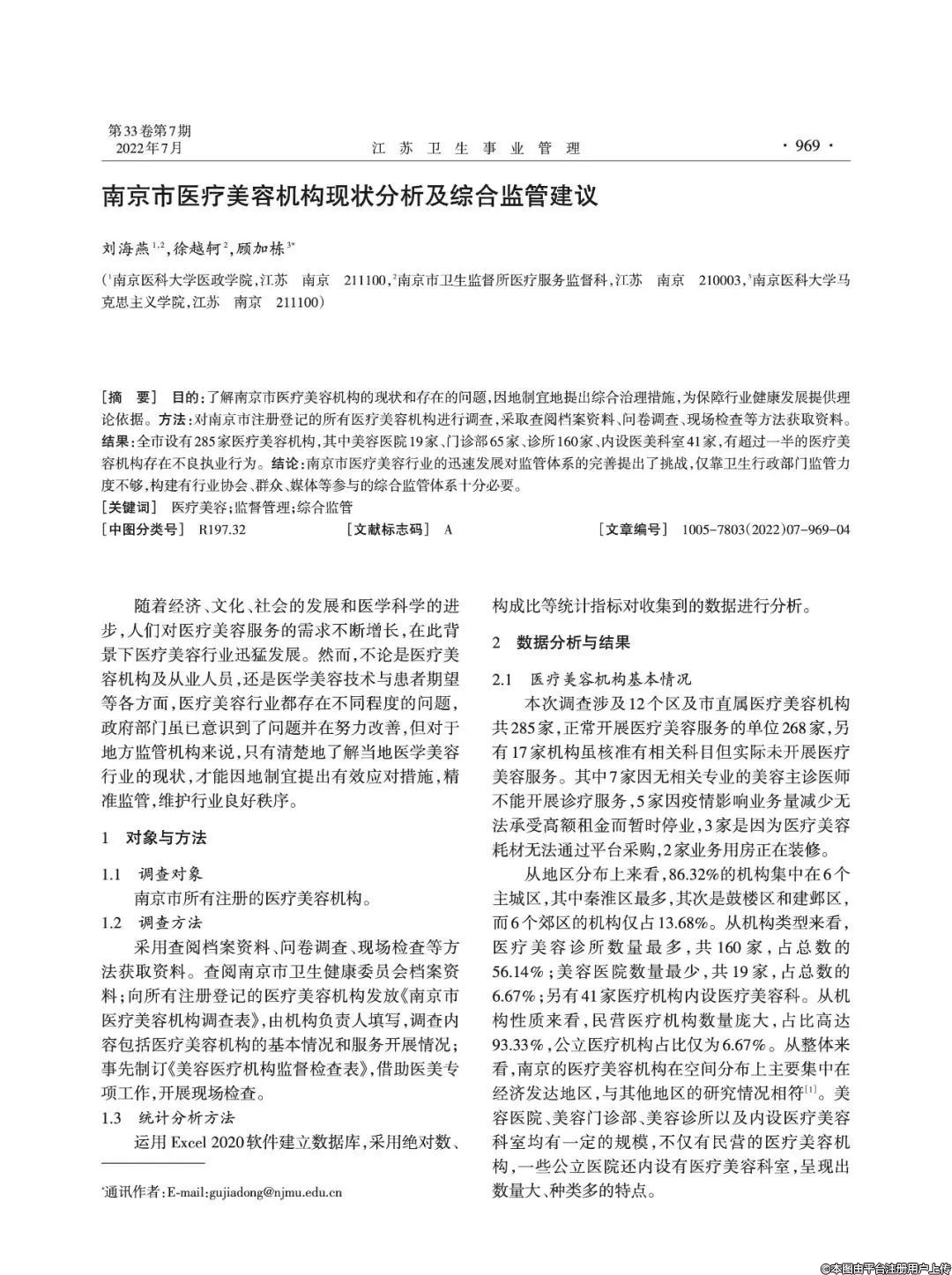 结论:南京市医疗美容行业的迅速发展对监管体系的完善提出了挑战,仅靠卫生行政部门监管力度不够,构建有行业协会、群众、媒体等参与的综合监管体系十分必要。