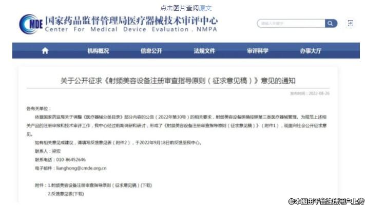 依据国家药监局关于调整《医疗器械分类目录》部分内容的公告(2022年第30号)的相关要求,射频美容设备明确按照第三类医疗器械管理。为规范上述相关产品的注册申报和技术审评工作,我中心经过前期调研和研讨,形成了《射频美容设备注册审查指导原则(征求意见稿)》(附件1),现面向社会公开征求意见。