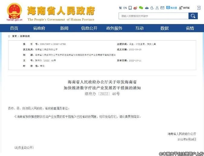 10月11日消息,海南省人民政府办公厅对外印发《海南省加快推进数字疗法产业发展若干措施》(以下简称“《若干措施》”)。