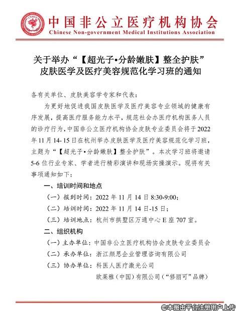 为更好地促进我国皮肤医学及医疗美容专业领域的健康有序发展,提高医疗服务能力水平,规范社会办医疗机构医务人员的诊疗行为,中国非公立医疗机构协会皮肤专业委员会将于2022年11月14日-11月15日在杭州举办皮肤医学及医疗美容规范化学习班,主题为“超光子 分龄嫩肤”整全护肤。本次学习班将邀请5-6位行业专家、学者进行精彩演讲和现场实操演示。现将有关事项通知如下: