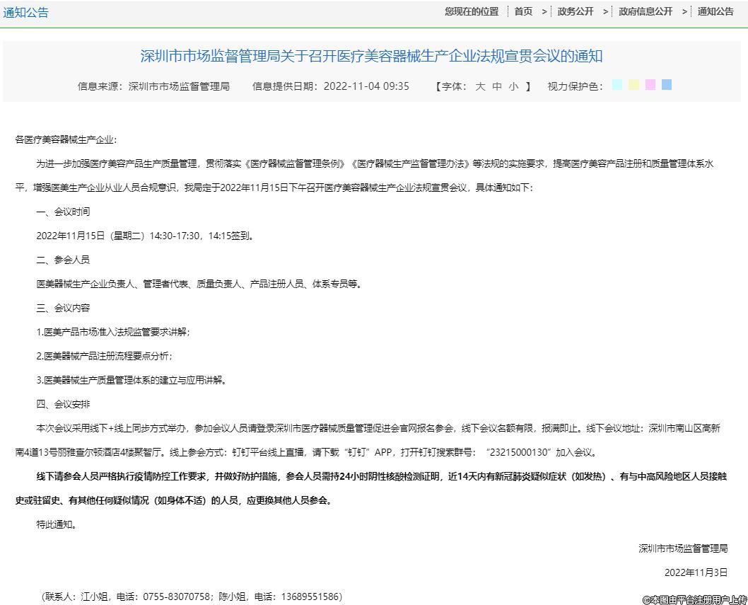 深圳市市场监督管理局关于召开医疗美容器械生产企业法规宣贯会议的通知