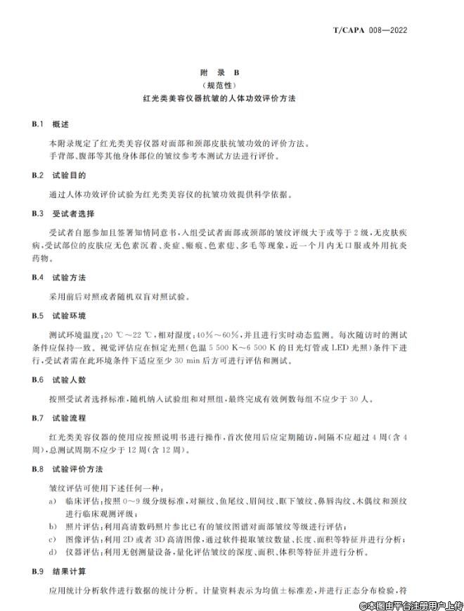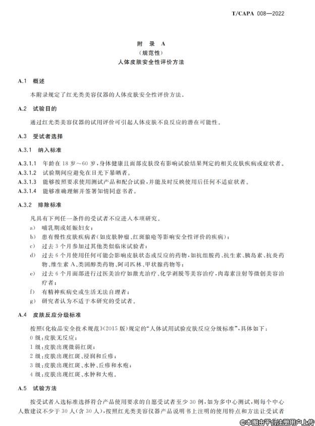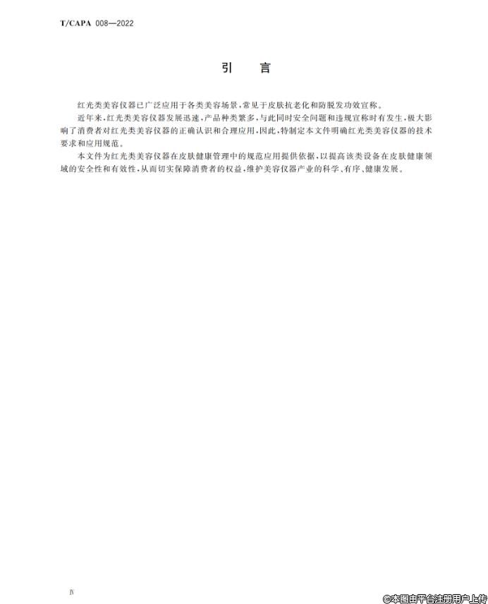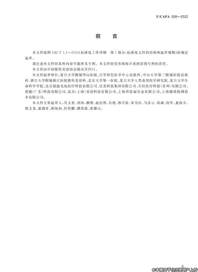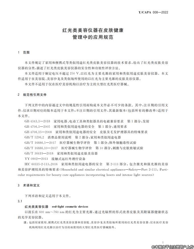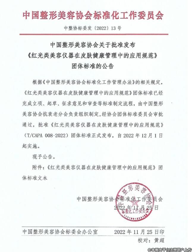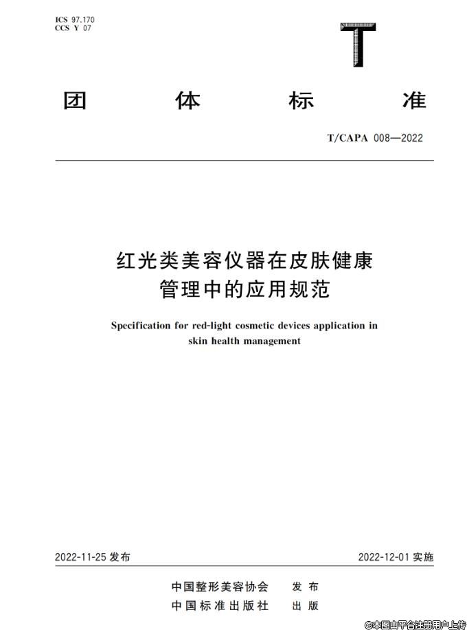 根据《中国整形美容协会标准化工作管理办法》的相关规定,《红光类美容仪器在皮肤健康管理中的应用规范》团体标准已经完成立项、起草、征求意见和审查等标准制定流程,由中国整形美容协会抗衰老分会负责组织制定,经协会团体标准委员会审批通过,批准《红光类美容仪器在皮肤健康管理中的应用规范》(T/CAPA 008-2022)团体标准正式发布,自2022年12月1日起实施。