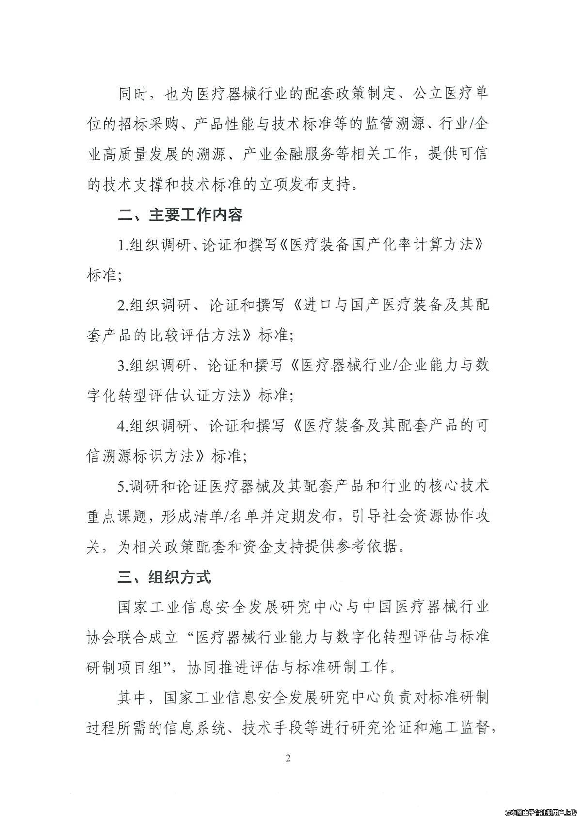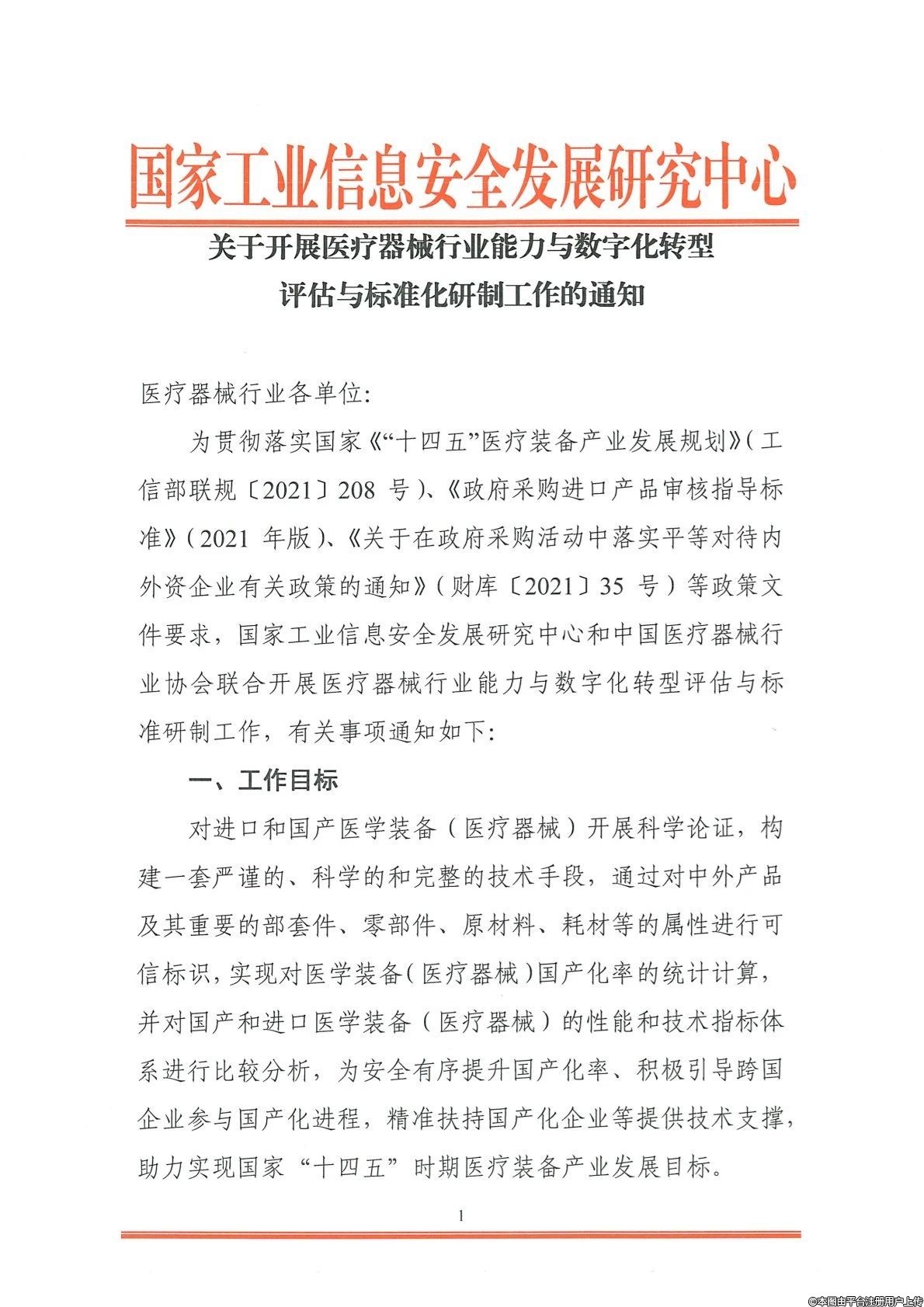为贯彻落实国家《“十四五”医疗装备产业发展规划》(工信部联规〔2021〕208号)、《政府采购进口产品审核指导标准》(2021 年版)、《关于在政府采购活动中落实平等对待内外资企业有关政策的通知》(财库〔2021〕35 号)等政策文件要求,国家工业信息安全发展研究中心和中国医疗器械行业协会联合开展医疗器械行业能力与数字化转型评估与标准研制工作,有关事项通知如下: