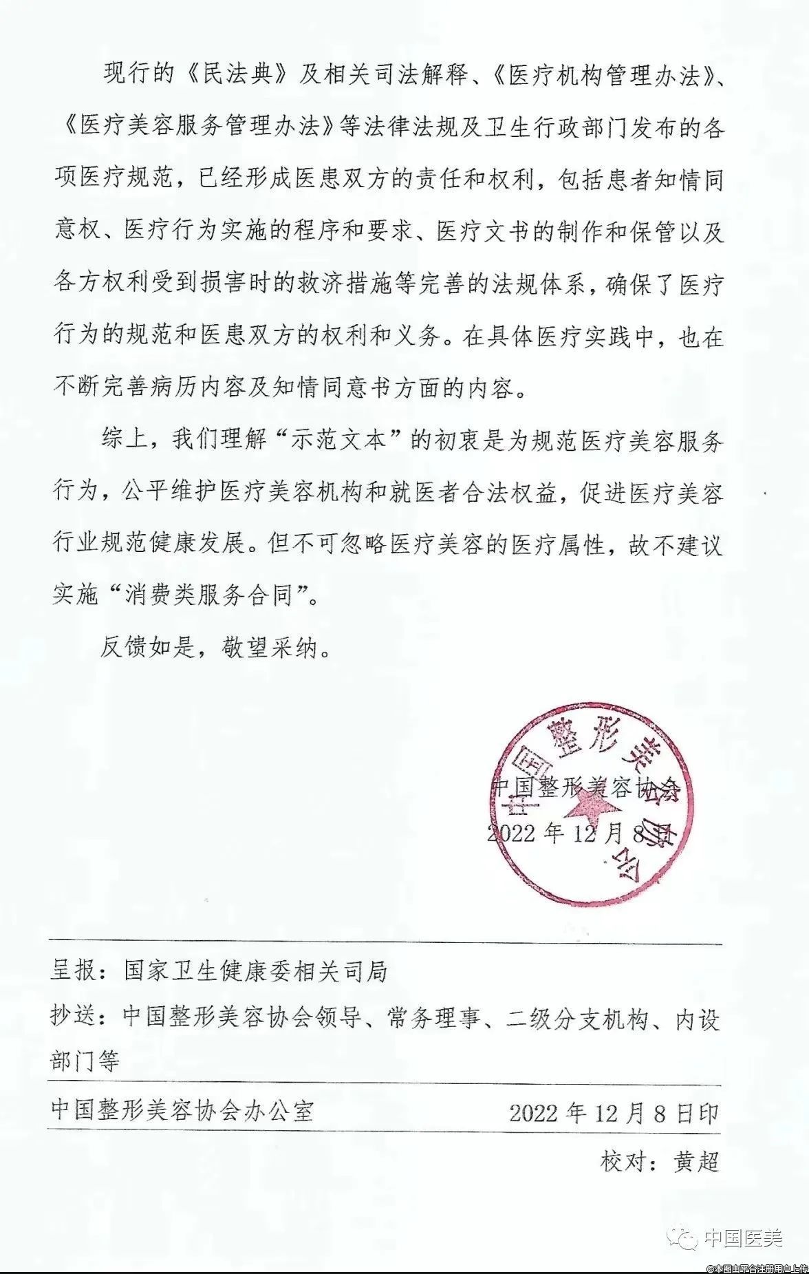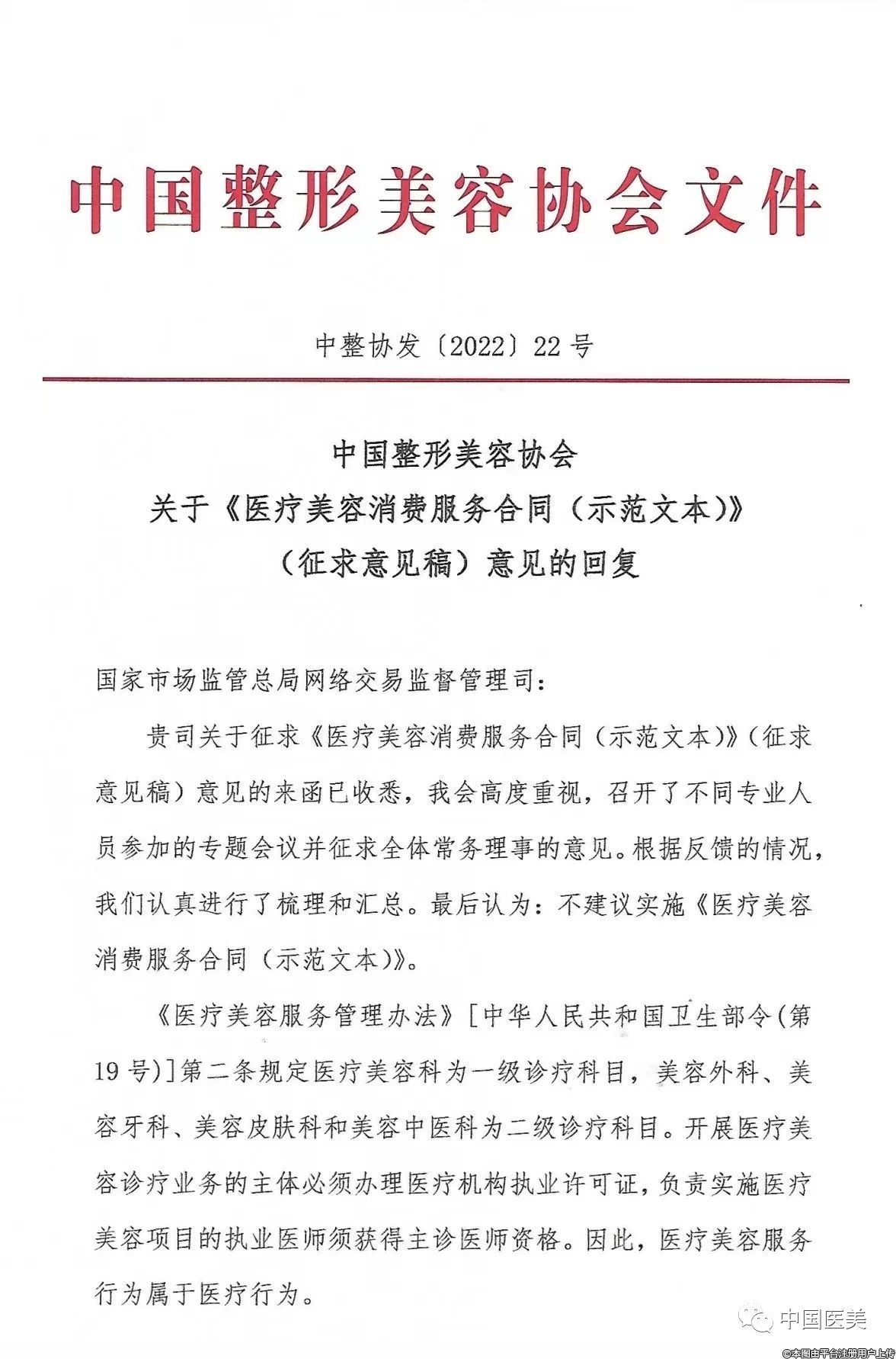 中国整形美容协会关于《医疗美容消费服务合同(示范文本)》(征求意见稿)意见的回复