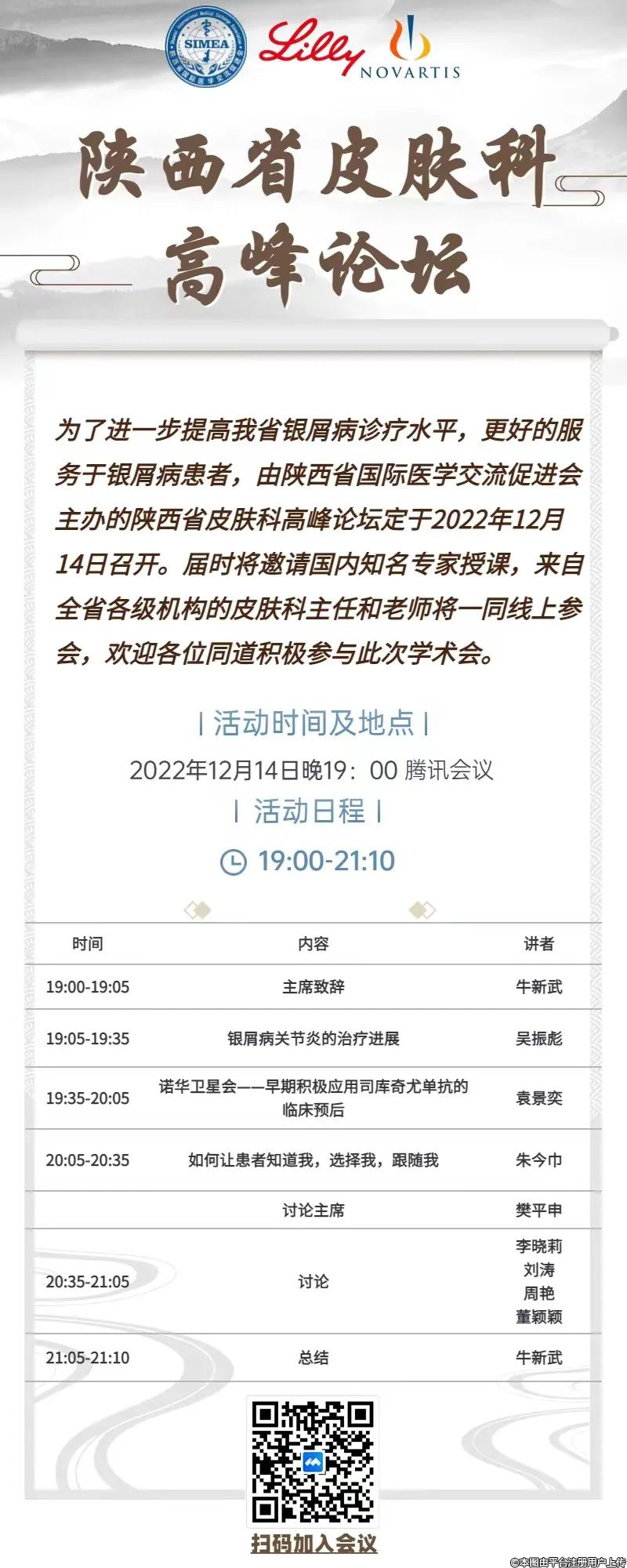 为了进一步提高陕西省银屑病的诊疗水平,更好的服务于银屑病患者,由陕西省国际医学交流促进会主办的陕西省皮肤科高峰论坛定于2022年12月14日召开。届时将邀请国内知名专家授课,来自全省各级机构的皮肤科主任和老师将一同线上参会,欢迎各位专家同道参加此次学术盛会。现将会议有关事项通知如下: