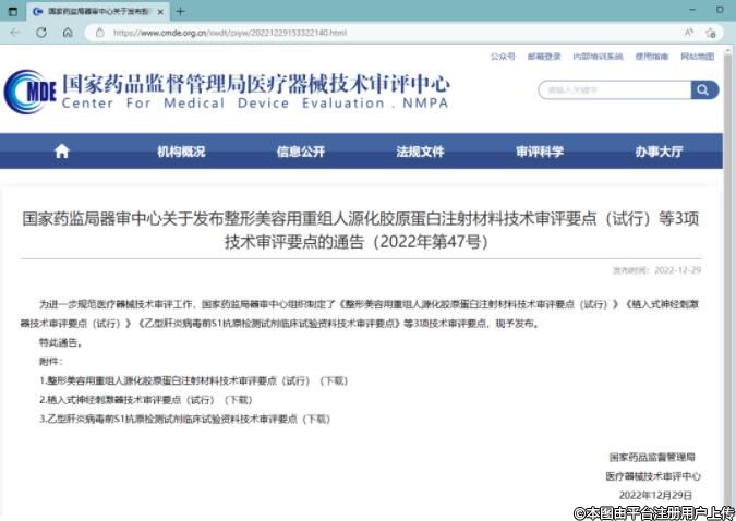 国家药监局器审中心发布整形美容用重组人源化胶原蛋白注射材料技术审评要点(试行)
