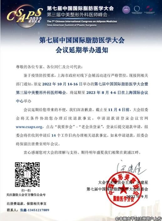会议延期举办通知 第七届中国国际脂肪医学大会