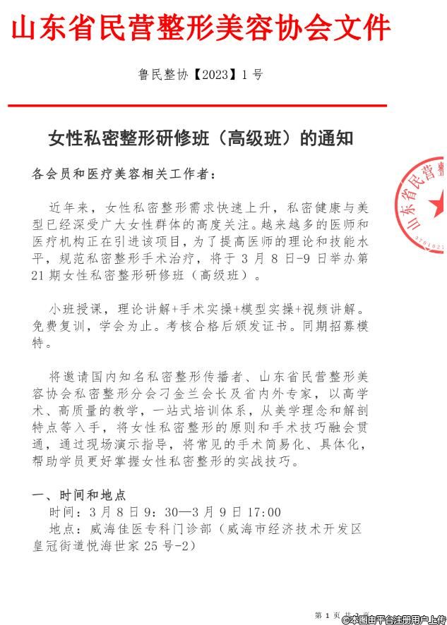 第21期女性私密整形研修班(高级班)将于3月8日-9日在威海举办,小班授课,理论讲解+手术实操+模型实操+视频讲解。免费复训,学会为止。考核合格后颁发证书。同期招募模特。