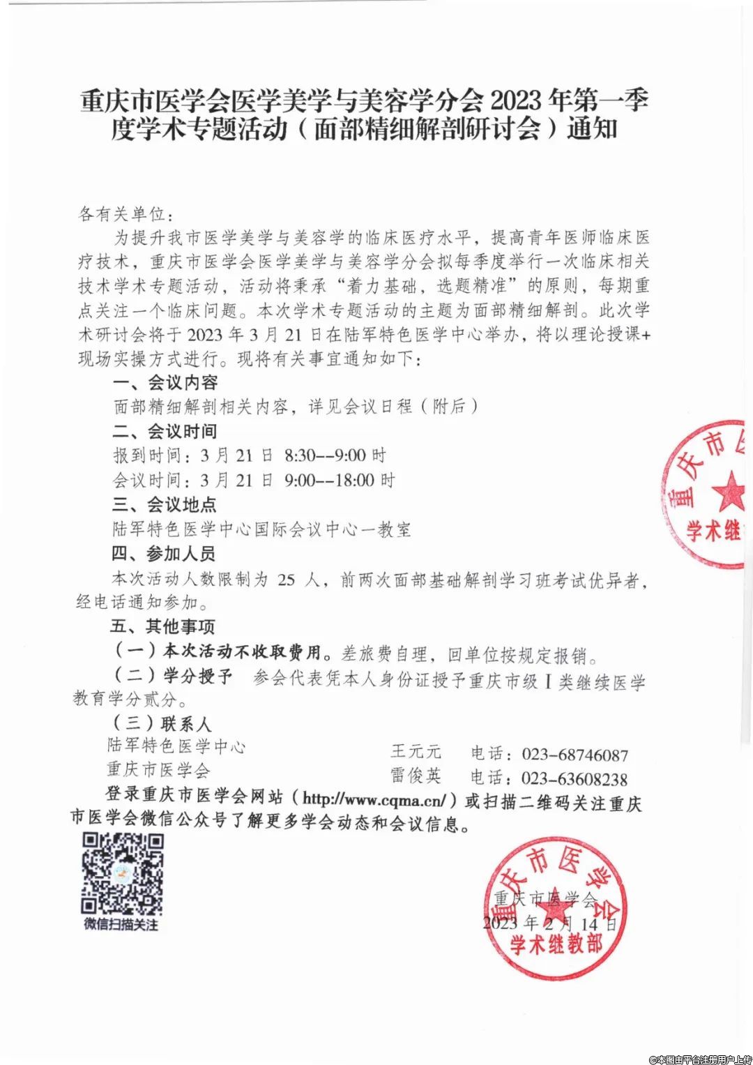 为提升重庆市医学美学与美容学的临床医疗水平,提高青年医师临床医疗技术,重庆市医学会医学美学与美容学分会拟每季度举行一次临床相关技术学术专题活动,活动将秉承“着力基础,选题精准”的原则,每期重点关注一个临床问题。本次学术专题活动的主题为面部精细解剖。此次学术研讨会将于2023年3月21日在陆军特色医学中心举办,将以理论授课+现场实操方式进行。现将有关事宜通知如下: