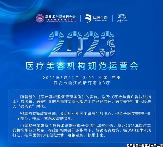 随着国家监管政策不断出台,医美行业未来将会以健康可持续发展的趋势走下去,加速了医美行业的合规化道路。华熙生物积极响应国家政策,加速合规化进程,将于5月11日在西安举办2023年医疗美容机构规范运营会。