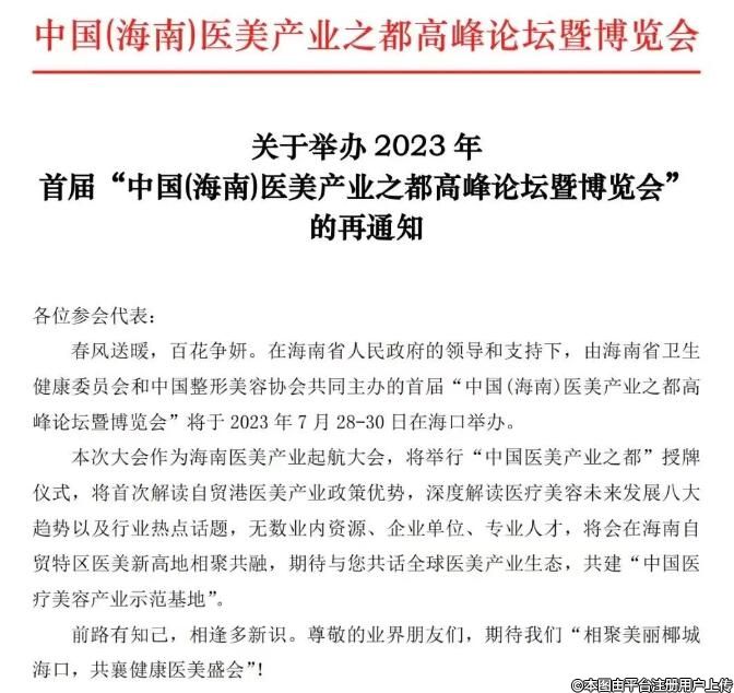 为进一步贯彻推进建设健康中国的国家战略部署,由中国整形美容协会和海南省卫生健康委员会共同主办的首届“中国(海南)医美产业之都高峰论坛暨博览会”将于2023年7月28-30日在海口国际会议展览中心举办。本次大会医美产业最新发展趋势和行业热点话题、医疗美容行业的标准化与规范化、中国医美的特色与面临的大变局以及医美产业政策与行业监管等主题展开分论坛交流。