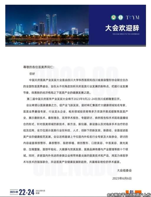 中国天府医美产业发展大会是由四川大学华西医院和四川省美容整形协会联合主办的全国性医美界盛会,旨在从不同角度剖析天府医美行业发展的新特点,把握行业发展节奏,探索新的经济格局之下医美产业的健康发展之路。