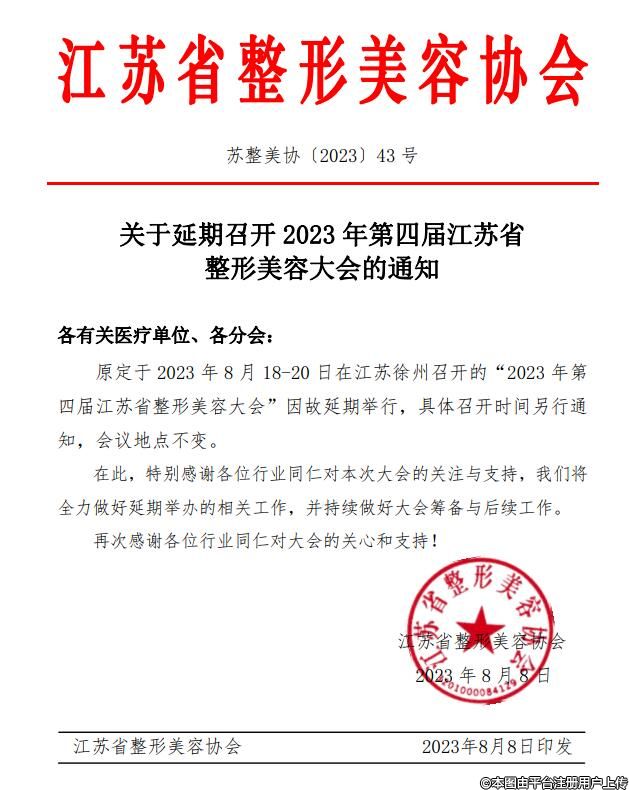 关于延期召开2023年第四届江苏省整形美容大会的通知