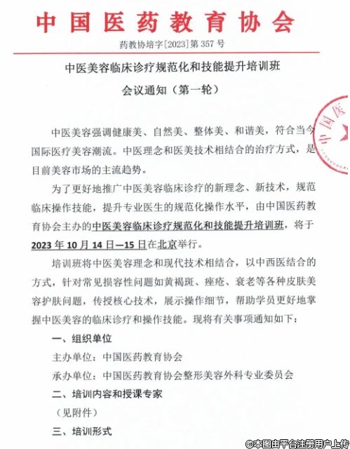 为了更好地推广中医美容临床诊疗的新理念、新技术,规范临床操作技能,提升专业医生的规范化操作水平,由中国医药教育协会主办的中医美容临床诊疗规范化和技能提升培训班,将于2023年10月14日—15日在北京举行。