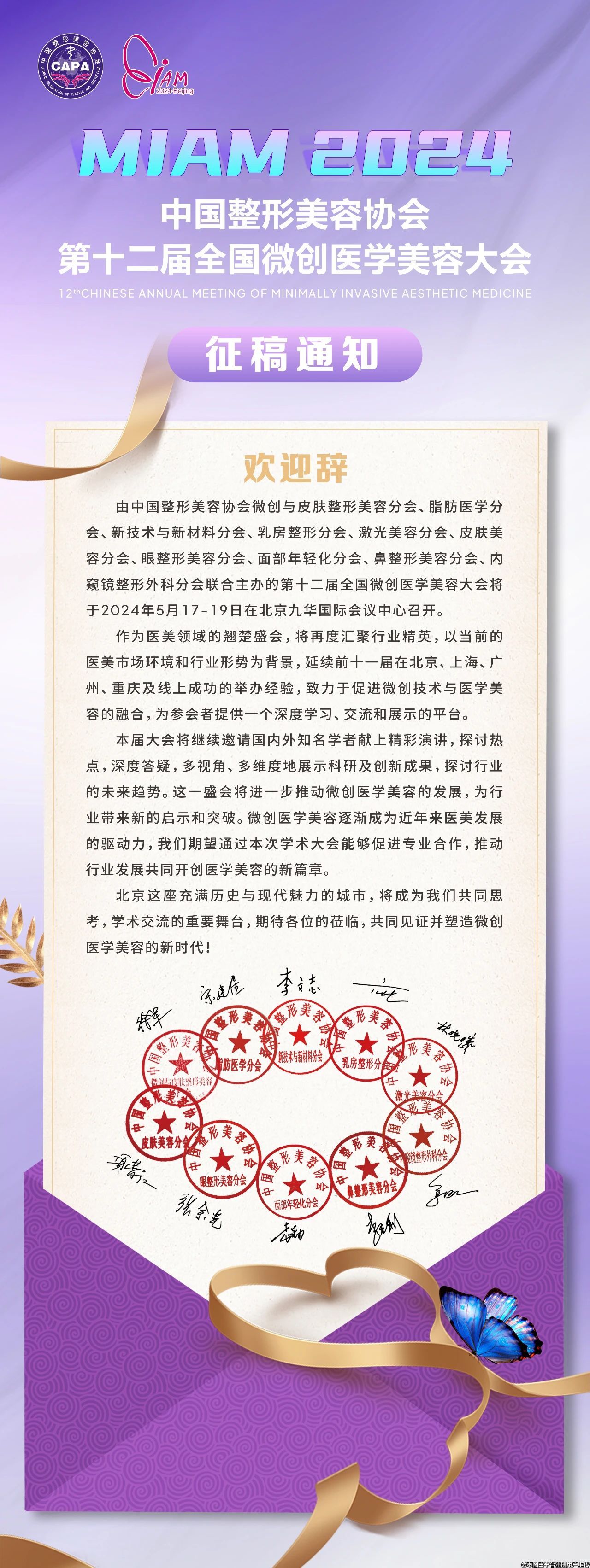 由中国整形美容协会微创与皮肤整形美容分会、脂肪医学分会、新技术与新材料分会、乳房整形分会、激光美容分会、皮肤美容分会、眼整形美容分会、面部年轻化分会、鼻整形美容分会、内窥镜整形外科分会联合主办的第十二届全国微创医学美容大会将于2024年5月17-19日在北京九华国际会议中心召开。