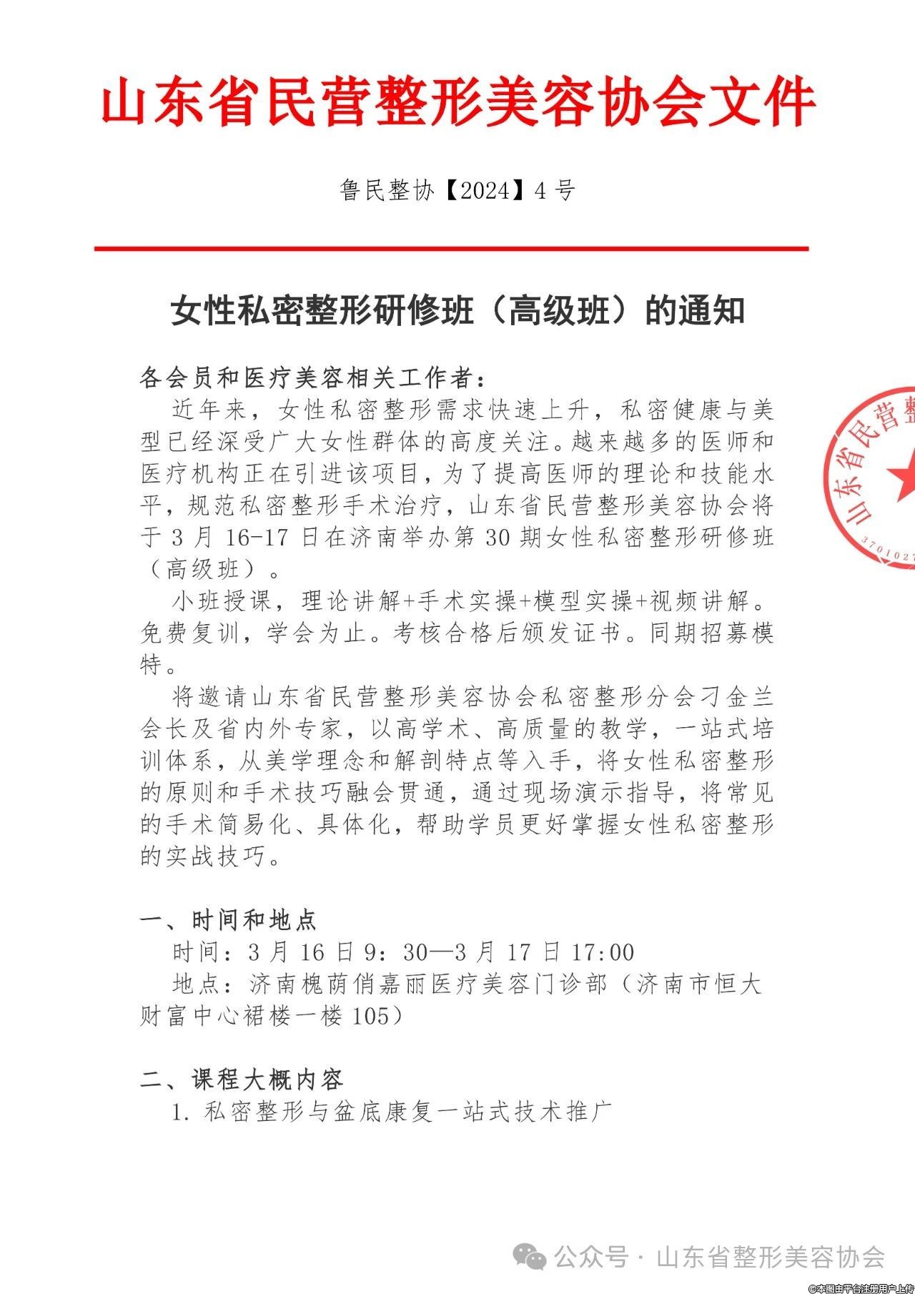 3月16-17日第30期女性私密整形研修班(高级班)的通知