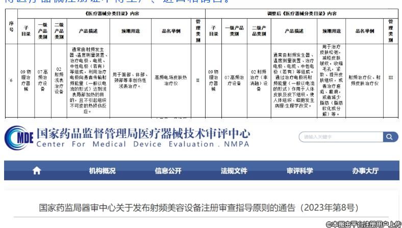 而对于射频美容设备的注册申报,国家药监局器审中心于2023年4月发布了《射频美容设备注册审查指导原则》。其中包括其适用范围、监管信息、产品描述、风险管理资料、产品技术要求、检验报告、研究资料以及临床评价要求等。