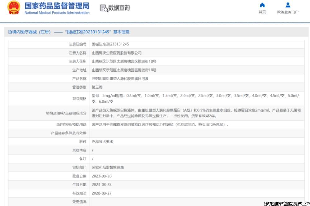 这是一款与山西锦波生物合作的械III类注射胶原蛋白,注射证号为:国械注准20233131245。