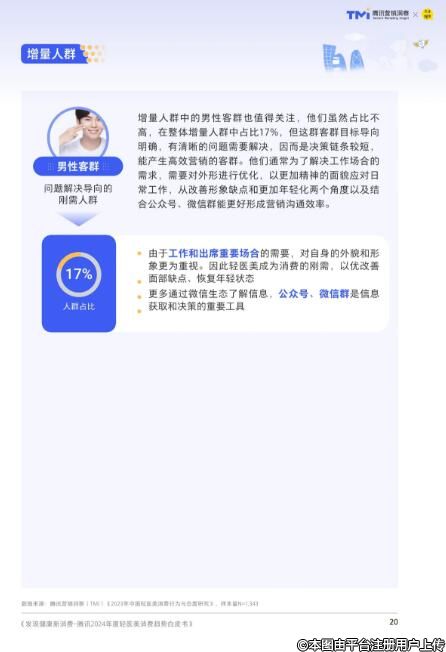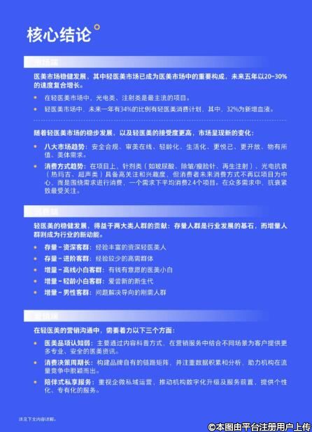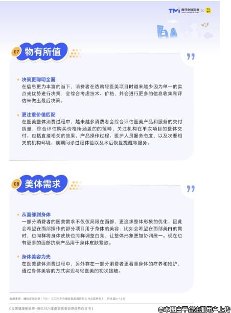 安全合规指求美者要验证机构的背景、人员的资质、产品的真伪等。审美在线指求美者从于篇一律朝着自然个性转变。轻龄化指求美者里年轻人比例增大,在全球也首屈一指。生活化指求美者会把更多舒适且有效的治疗当作更美好的生活方式。更悦己指求美者的需求驱动力开始来源于自我认可和自我追求。更开放是求美者不再忌讳医美,愿意分享医美。物有所值指求美者不是只看价格,而是要看价值,价值匹配价格的项目才能打动他们。美体需求是求美者从面部美容到身体健康在延生,其中孕育着极大的新市场。
