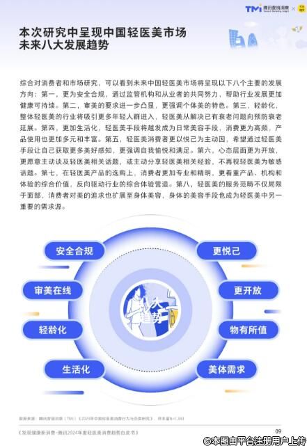 中国轻医美未来发展八大发展趋势包括:安全合规、审美在线、轻龄化、生活化、更悦己、更开放、物有所值、美体需求。