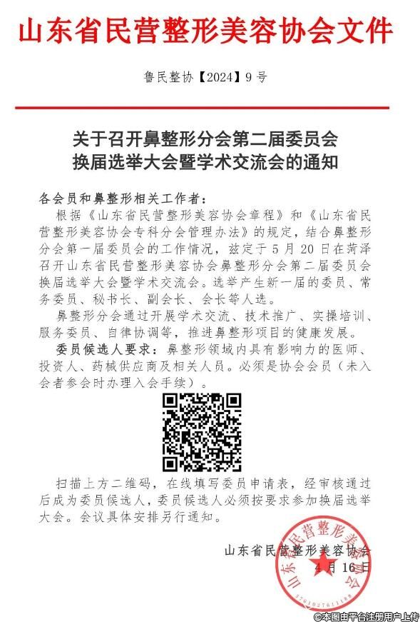 鼻整形分会通过开展学术交流、技术推广、实操培训、服务委员、自律协调等,推进鼻整形项目的健康发展。委员候选人要求:鼻整形领域内具有影响力的医师、投资人、药械供应商及相关人员。必须是协会会员(未入会者参会时办理入会手续)。扫描下方二维码,在线填写委员申请表,经审核通过后成为委员候选人,委员候选人必须按要求参加换届选举大会。