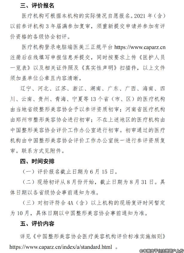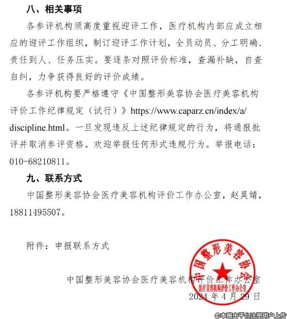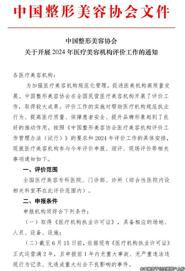 为加强医疗美容机构规范化管理,促进医美机构高质量发展。中国整形美容协会在全国民营医疗美容机构开展了评价工作,取得较大成果。评价工作的实施对帮助医疗机构规范执业行为、提高医疗质量、保障患者安全、提升品牌形象起到了良好的推动作用。按照《中国整形美容协会医疗美容机构评价工作管理办法(试行)》的要求和2024年评价工作的具体安排现就医疗美容机构参与今年评价申报、迎评、现场评价等。