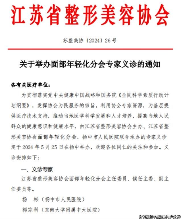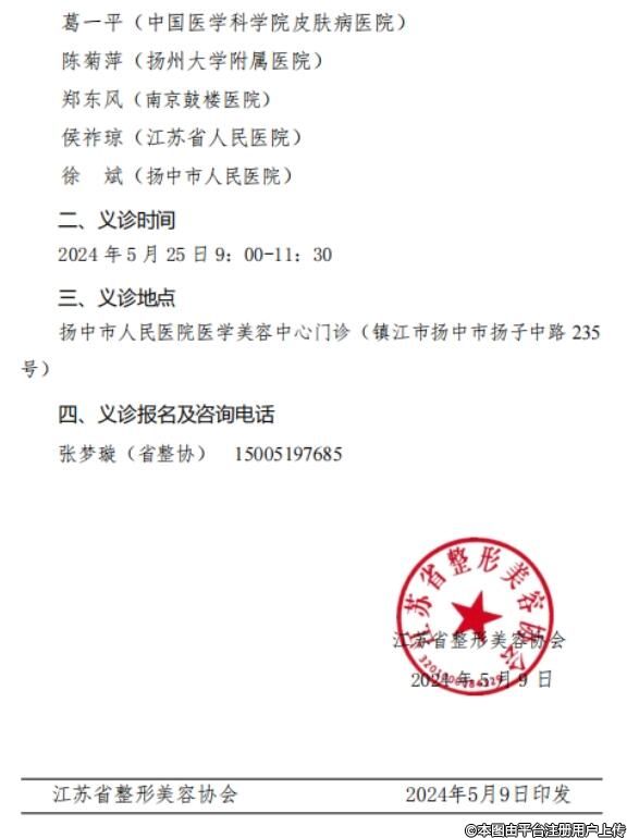 为贯彻落实党中央健康中国战略和国务院《全民科学素质行动计划纲要》,发挥协会为民服务的宗旨,利用协会专家资源,为基层提供医疗技术支持,推动当地医学科学发展和人才培养,提高当地人民群众的健康意识和健康水平,由江苏省整形美容协会主办、江苏省整形美容协会面部年轻化分会、扬中市人民医院联合承办的专家义诊定于2024年5月25日在扬中举办,欢迎各位同仁的关注和参加。义诊安排如下: