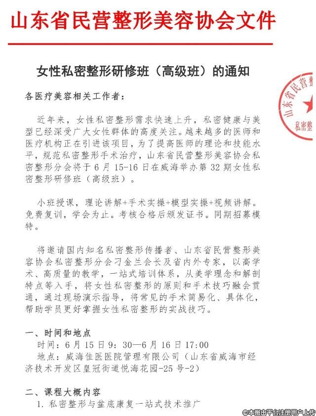 近年来,女性私密整形需求快速上升,私密健康与美型已经深受广大女性群体的高度关注。越来越多的医师和医疗机构正在引进该项目,为了提高医师的理论和技能水平,规范私密整形手术治疗,山东省民营整形美容协会私密整形分会将于6月15-16日在威海举办第32期女性私密整形研修班(高级班)。