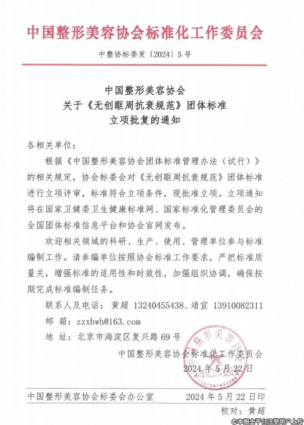 根据《中国整形美容协会团体标准管理办法(试行)》的相关规定,协会标委会对《无创眶周抗衰规范》团体标准进行立项评审,标准符合立项条件,现批准立项。立项通知将在国家卫健委卫生健康标准网、国家标准化管理委员会的全国团体标准信息平台和协会官网发布。