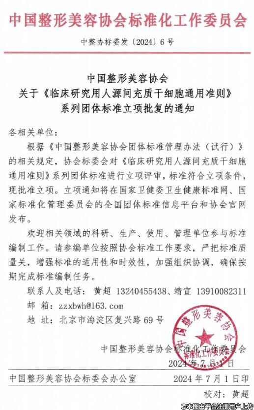中国整形美容协会关于《临床研究用人源间充质干细胞通用准则》系列团体标准立项批复的通知