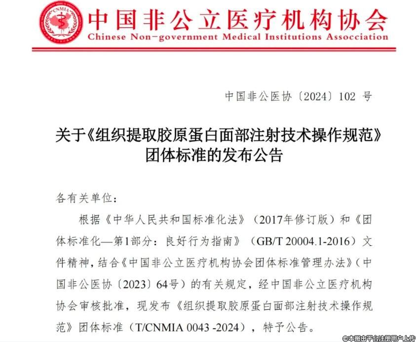 2024年7月6日上午,中国非公立医疗机构协会整形与美容专委会(以下简称专委会)2024年度学术年会在武汉光谷会展中心成功召开。大会由专委会和中国整形美容协会医美线技术分会(以下简称线分会)共同举办。在本次年会开幕式上,《组织提取胶原蛋白面部注射技术操作规范》团体标准正式发布。