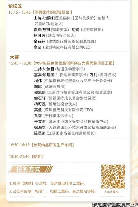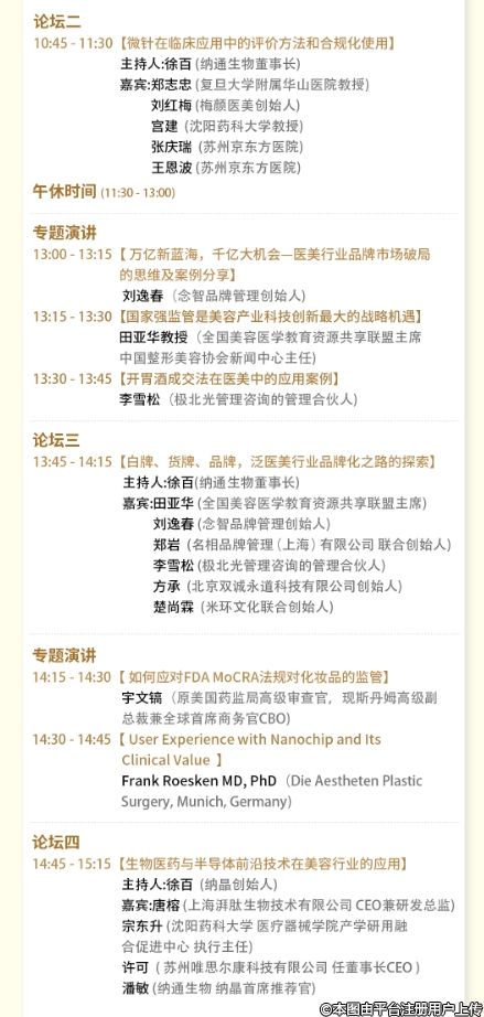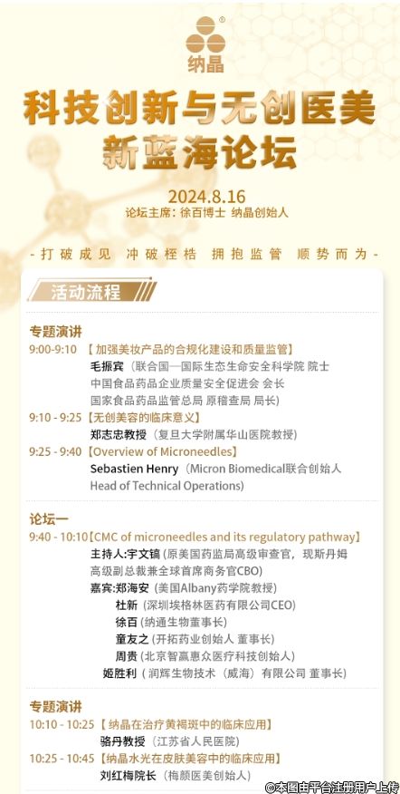 本次论坛汇聚了生物医药、医疗美容、美容护肤、政府监管、大健康抗衰老、品牌营销、消费医疗投资等领域的专家,旨在分享最新的行业洞见和技术创新,为您的机构提供安全、合法、有效的解决方案。通过真实案例分析,特别是纳晶的成功实践,帮助大家了解国家强监管是美容产业科技创新最大的战略机遇,并探讨如何拥抱监管,实现合法合规的长期盈利。