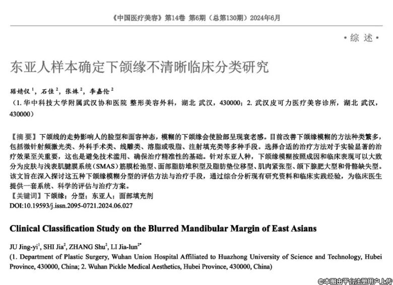 摘要:下颌线的走势影响人的脸型和面容神态,模糊的下颌缘会使脸部呈现衰老感。目前改善下颌缘模糊的方法种类繁多,包括微针射频激光“类、外科手术类、线雕类、溶脂或吸脂、注射填充类等多种手段。选择合适的治疗方法对于实验显著的治疗效果至关重要,这也是避免技术滥用、确保治疗精准性的基础。针对东亚人种,下颌缘模糊按照成因和临床表现可以大致分为皮肤与浅表肌腱膜系统(SMAS)筋膜松弛型、面部脂肪堆积型及脂肪垫位移型、肌肉紧张型、颌下腺肥大型和骨骼缺失型。该文旨在深入探讨这五种下颌缘模糊分型的评估方法与治疗手段,通过综合分析现有研究资料和临床实践经验,为临床医生提供一套系统、科学的评估与治疗方案。