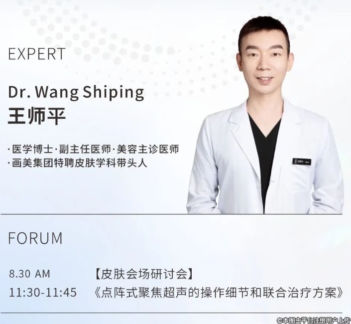 8月30日11:30-11:45,在西安国际会展中心会议楼二楼多功能厅C美容皮肤会场,画美集团特聘皮肤学科带头人王师平博士将以《点阵式聚焦超声的操作细节和联合治疗方案》为主题进行现场分享,为与会嘉宾带来更精炼的超声王技术理论知识,及更实用的临床应用经验。
