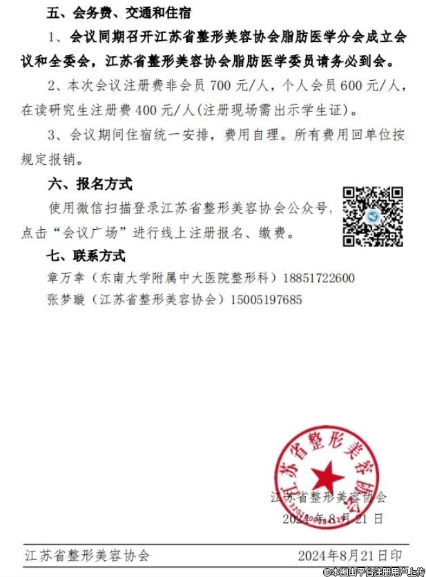为发挥江苏省整形美容协会脂肪医学分会(筹)的引领作用,推动我省脂肪医学诊疗事业的发展,经协会研究,由江苏省整形美容协会主办、江苏大学附属医院承办的脂肪医学 2024 年学术年会定于2024年10月12-13 日在镇江召开。