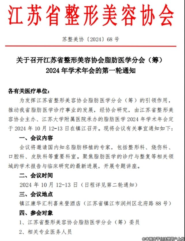 关于召开江苏省整形美容协会脂肪医学分会()2024 年学术年会的第一轮通知