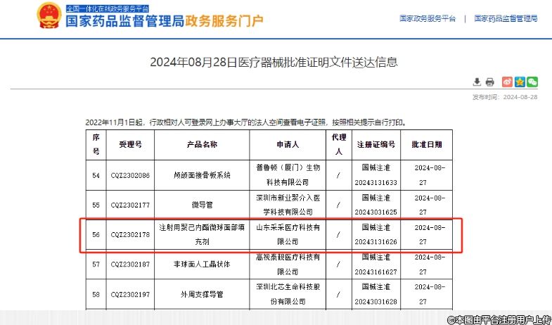 2024年8月27日,山东谷雨春旗下全资子公司山东采采医疗注册的“注射用聚己内酯微球面部填充剂”正式获得国家药监局批准,注册证号:国械注准20243131626,主要用于皮下组织注射填充,以纠正中重度鼻唇沟皱纹。
